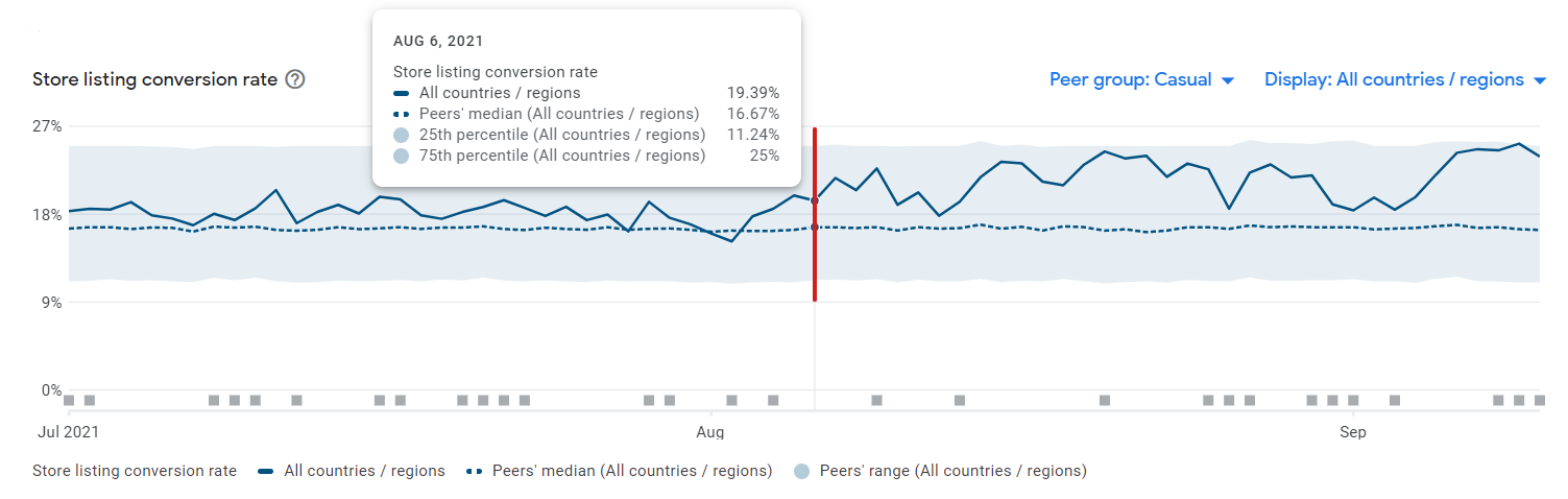 On this graph, you can see the store listing conversion rate for Spin the Bottle 30 days before the icon update on August 6 and 30 days after.