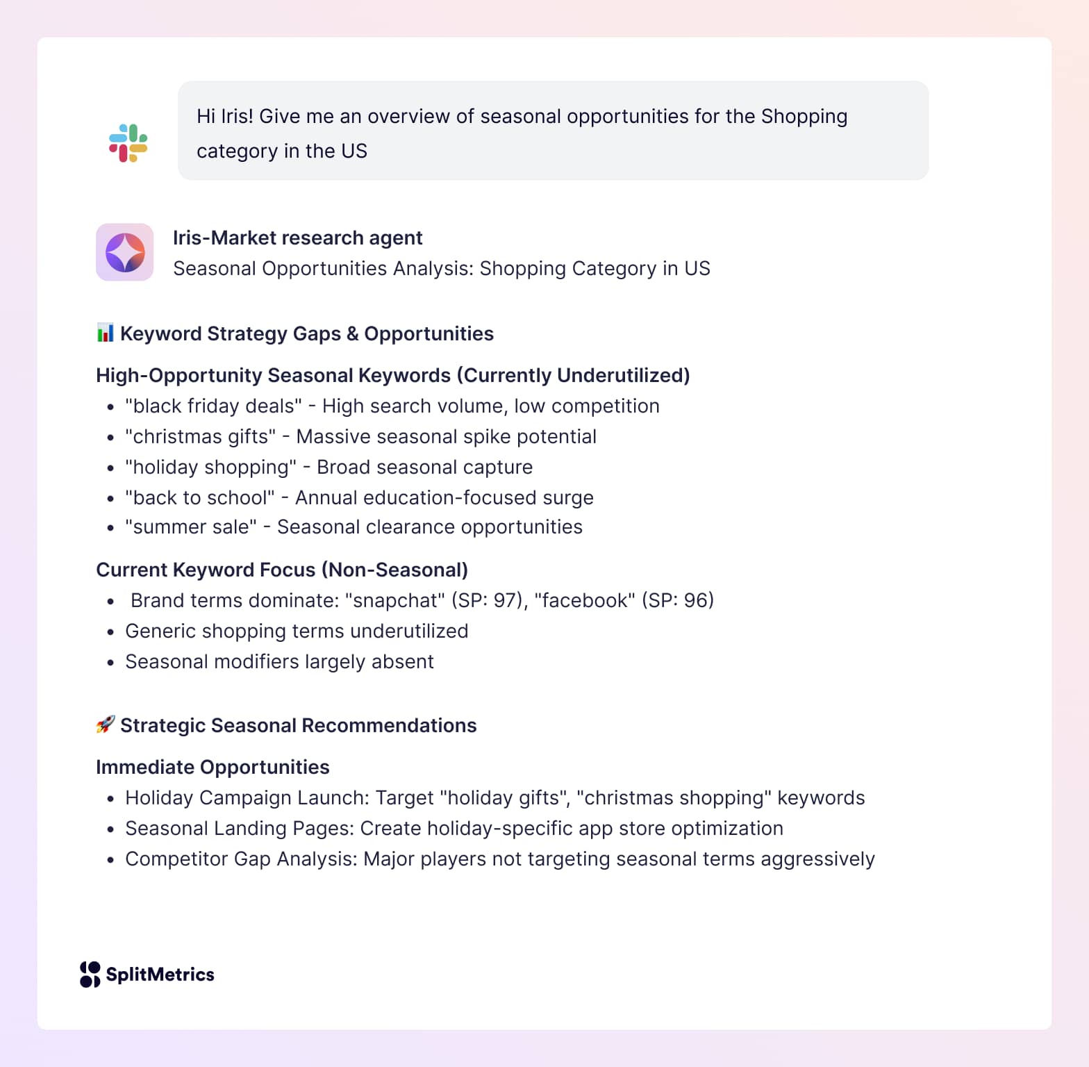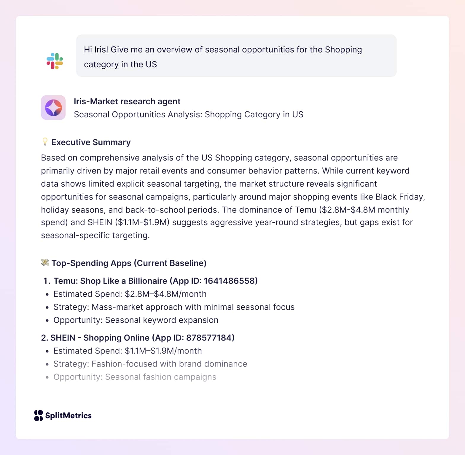 Iris is the first AI Agent purpose-built by SplitMetrics for Apple Ads and app store optimization (ASO). A simple conversation can provide a concise overview of key trends, competitors, and indicate the right direction for follow-up investigation. If you don’t know where to begin, a simple conversation with our Agent will surely move things forward.