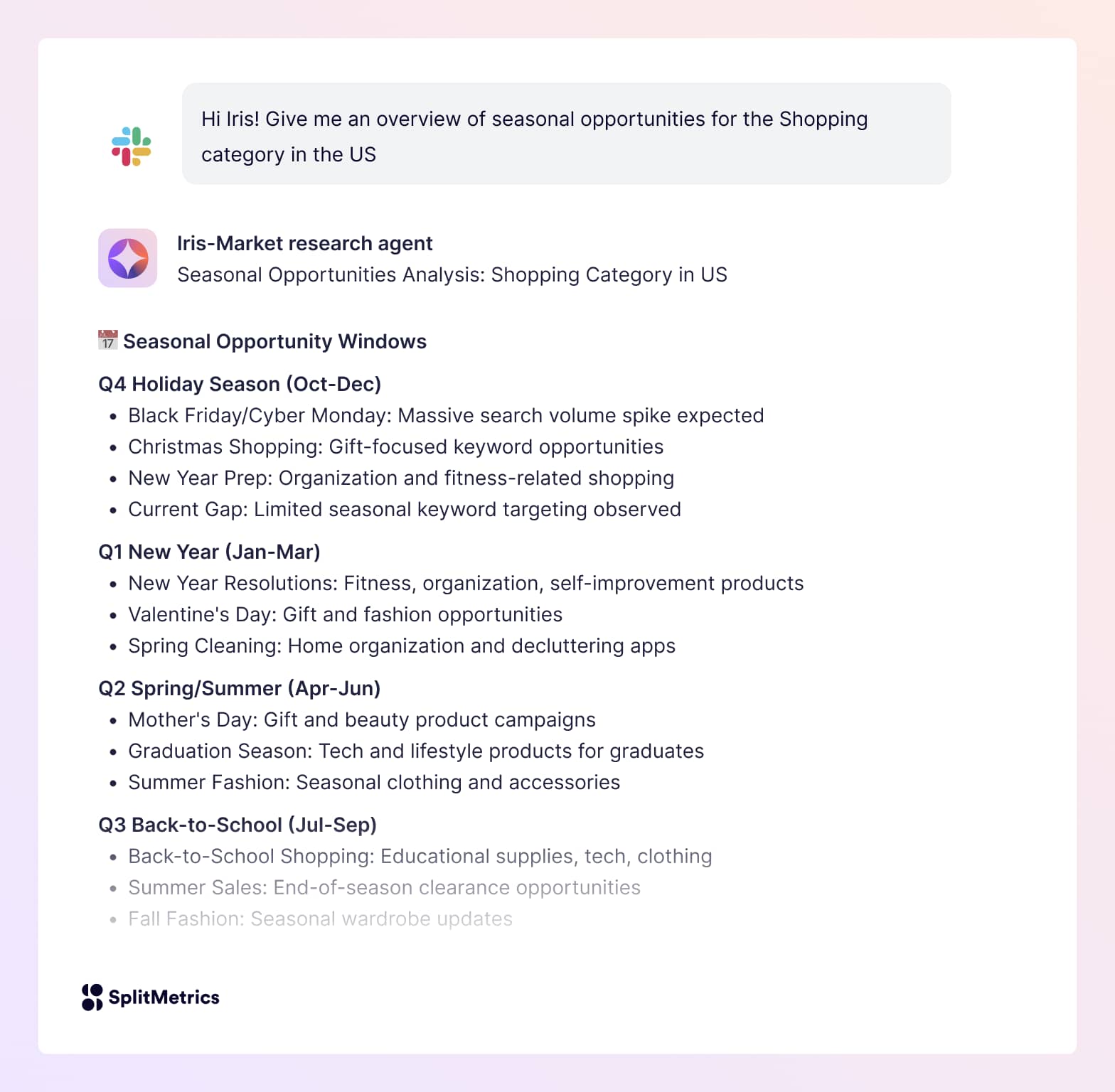 Seasonality is a predictable surge of user intent, but without data from your market and your competitors, you’re guessing when and where that surge will happen. Research turns a gamble into a calculated, data-driven strategy. Here’s what you need to investigate: