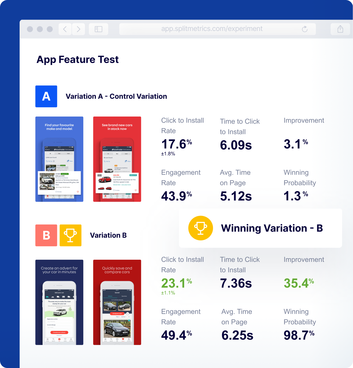 Win more conversions with SplitMetrics Optimize, an advanced mobile optimization platform for data-driven decision making, user behavior testing, validation of ideas, concepts, and features via A/B tests for iOS and Android on the product, search and category pages.