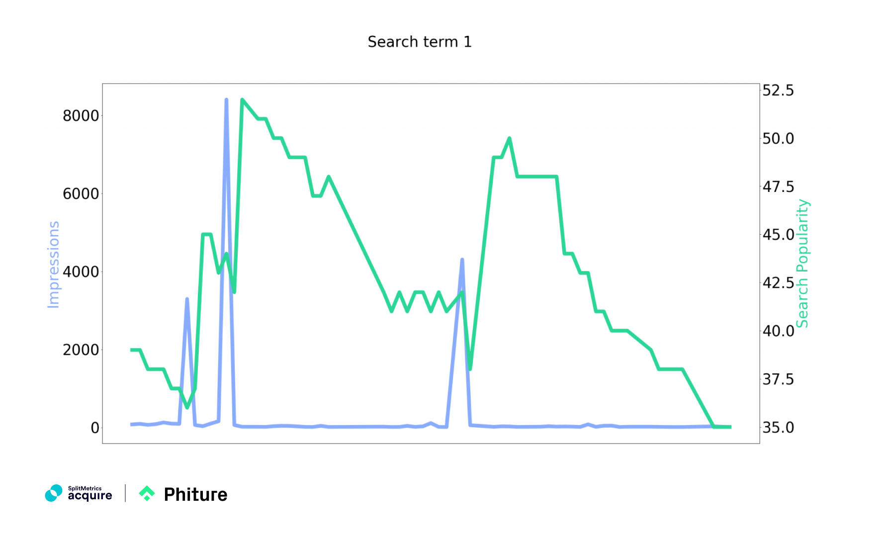 The observations above suggest that for each search term a spike in impressions is followed by an increase in Search popularity shortly after, with a time lag of about 4 days. It is likely that Search popularity is calculated as a moving average of up to 7 days, which is indicated by the adjustment period.
