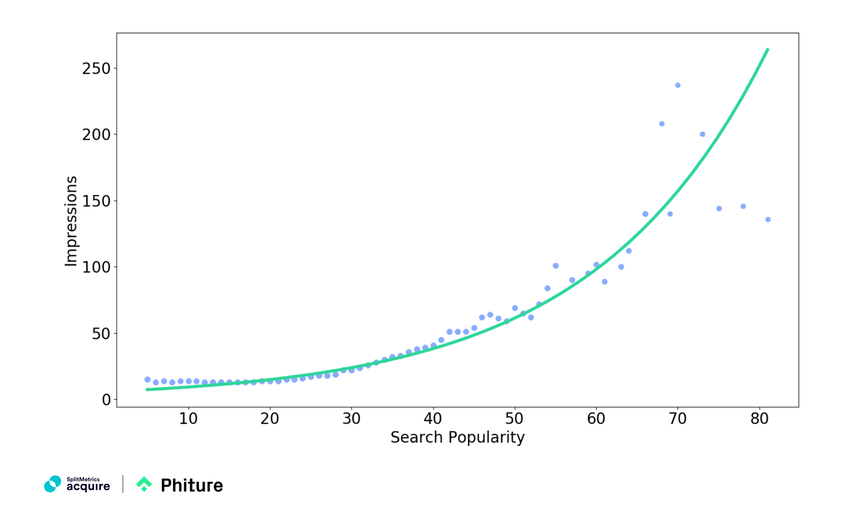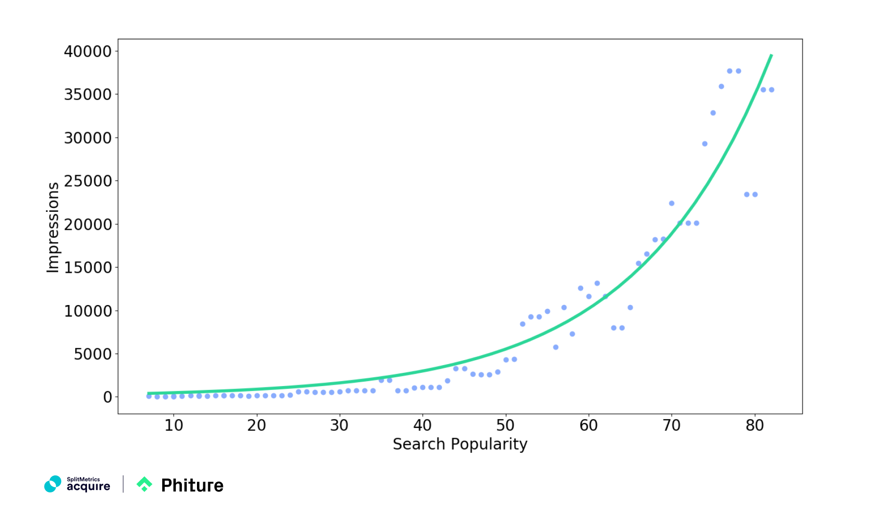 From this graph, you can see that a strong exponential increase starts from around the Search popularity of 40. So it makes sense to allocate more budget on keywords with the Search popularity of 40 and above, as they can bring about a significant increase in impressions for a maximized share of voice.