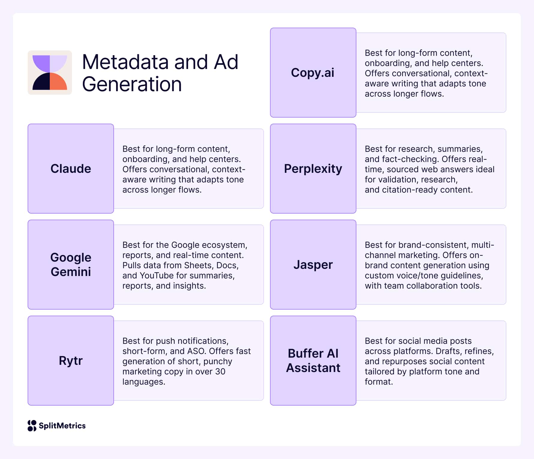 These tools use generative AI to create ad copy, metadata, push notifications, and more — helping you speed up iteration while aligning tone, format, and brand intent.