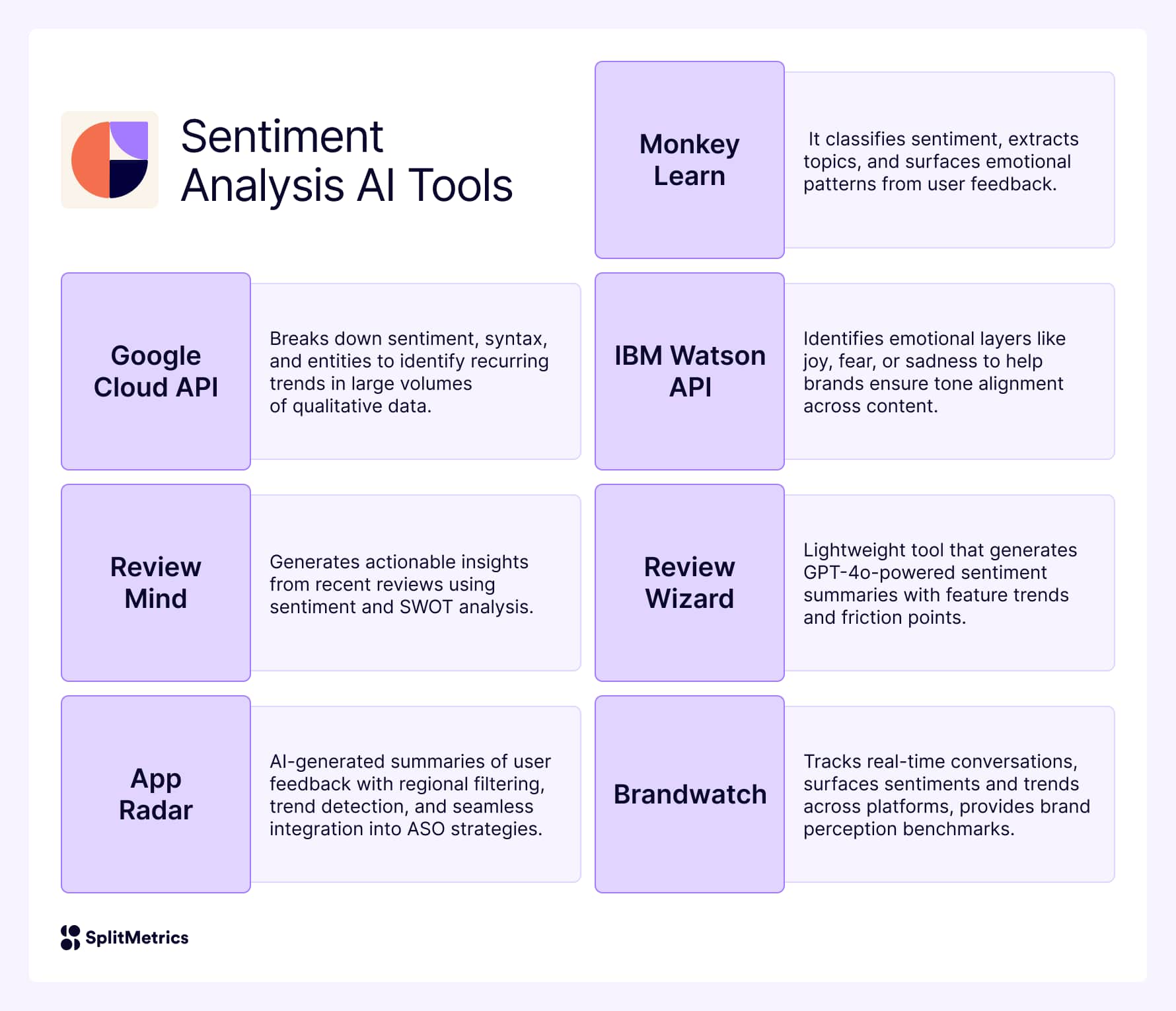 What it offers: Uses ML to classify sentiment, extract topics, and highlight emotion in app store reviews or social comments.