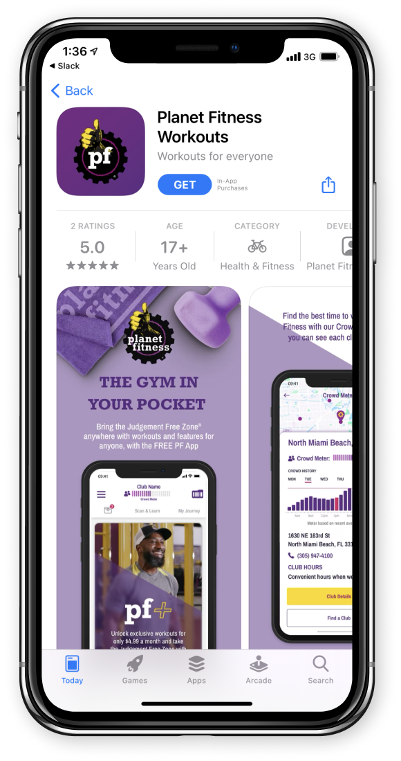 The first thing you see at the product page of Planet Fitness Workouts is the primary purpose of this app. “THE GYM IN YOUR POCKET” says the first screenshot – and this motto makes the app comprehensive for users who see it for the first time in their life.