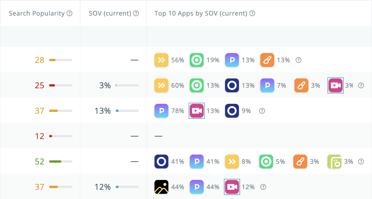 Which apps are displayed the most when users enter the search term? This feature helps you take a look around and discover your top-10 competitors and their Share of Voice range while bidding on each of the selected Apple Ads keywords.
