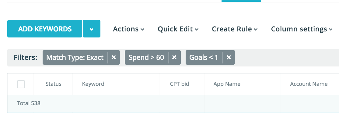 The system will automatically apply the filter and show all the keywords for the selected campaigns. It doesn’t matter which account or app these campaigns are associated with.