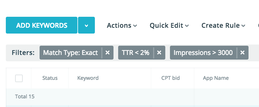 SerchAdsHQ filters can efficiently be used for bulk optimization or overall automation of Apple Ads management.