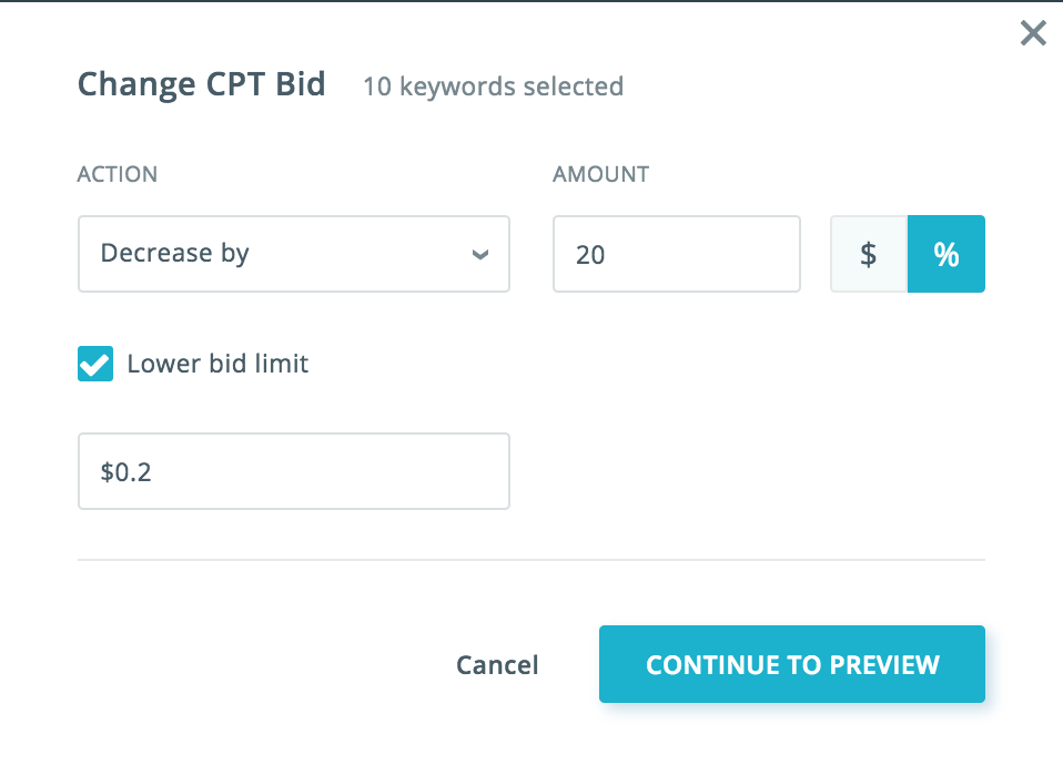 These keywords don’t fall under your goals (Target CPG). One of the easiest methods to boost performance and reduce spend waste is to lower bids. Let’s reduce them by 20%.