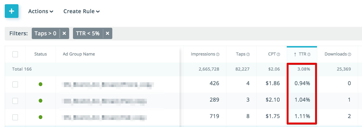 Low TTR indicates that there’s low relevance between a keyword and a creative set. By optimizing your ads, you can improve this score and thus get higher TTR.