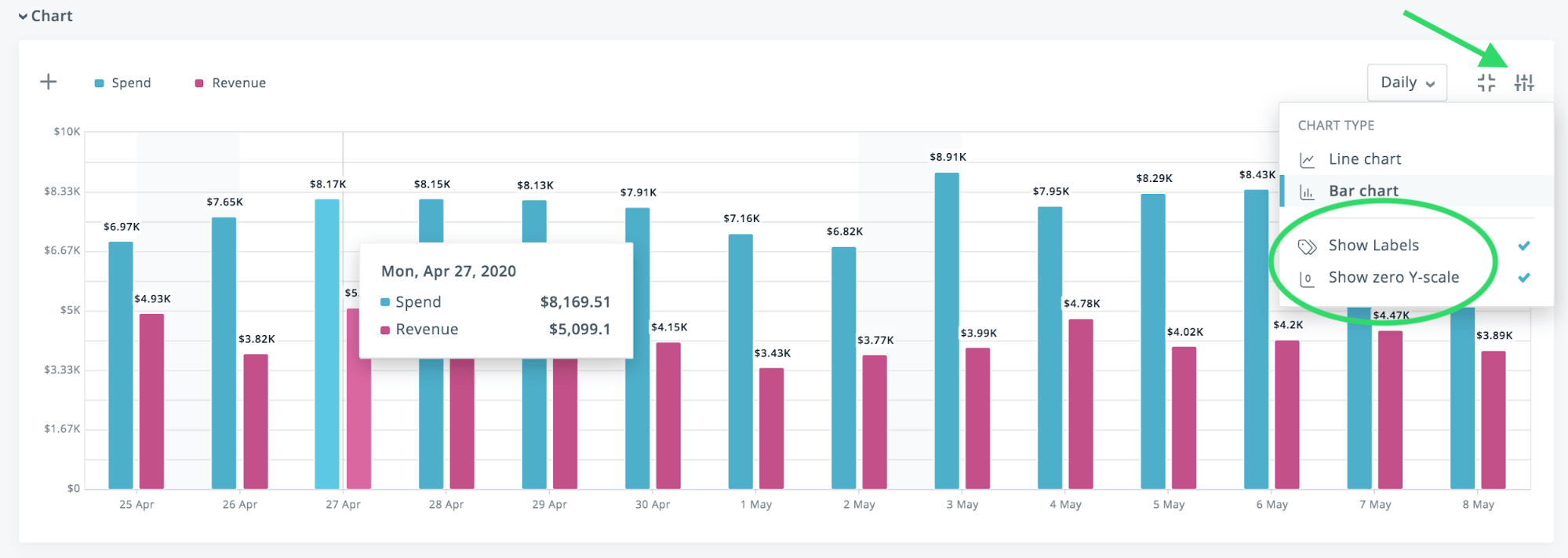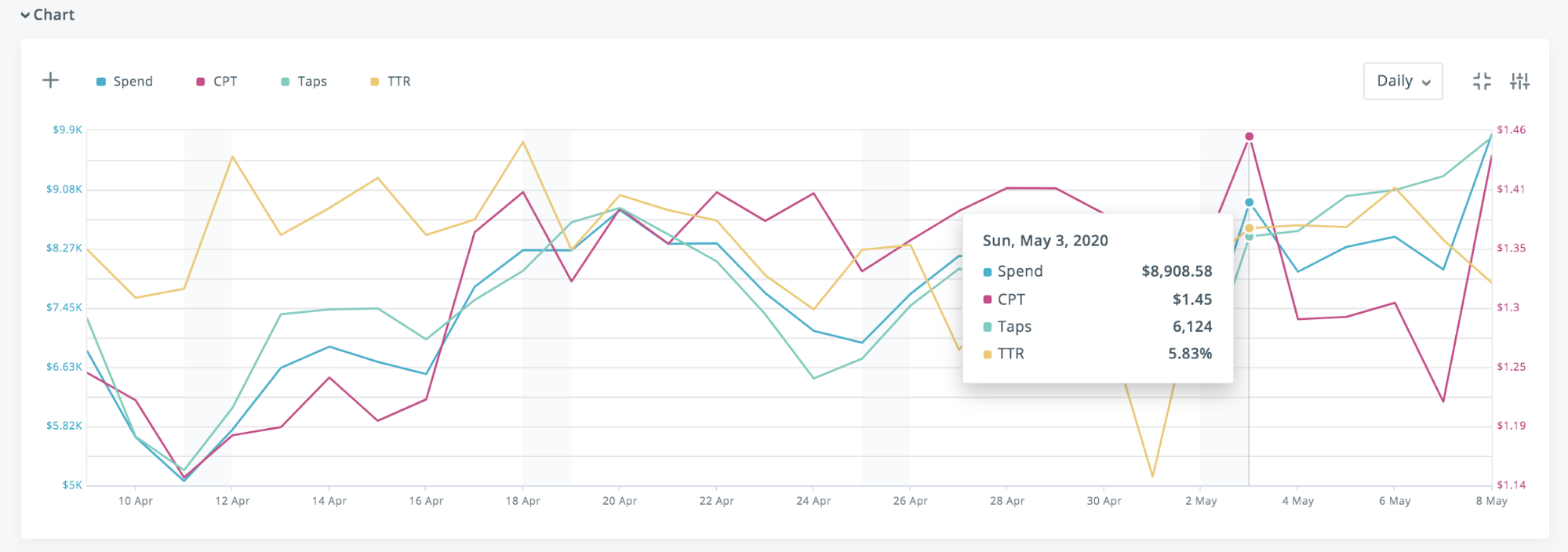 Now you can compare value (Spend, Costs, Revenue), ratios (TTR, CR, etc.) and numbers (Impressions, Taps, Conversions) the right way. Metrics of the same kind can be compared on a single scale and, moreover, you can also use an absolute scale and add labels to see exact values: