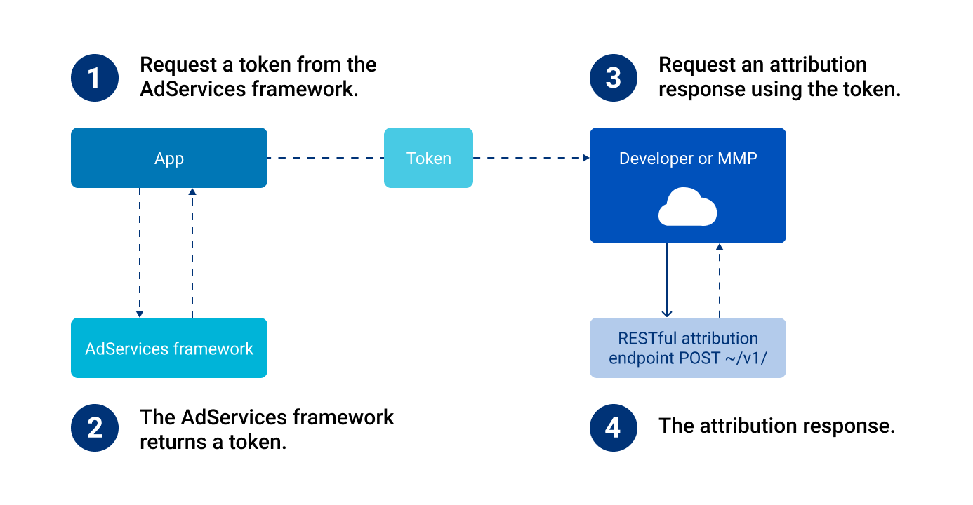 These frameworks are built into SDK by MMPs. The following diagram illustrates using the AdServices framework to retrieve attribution data.